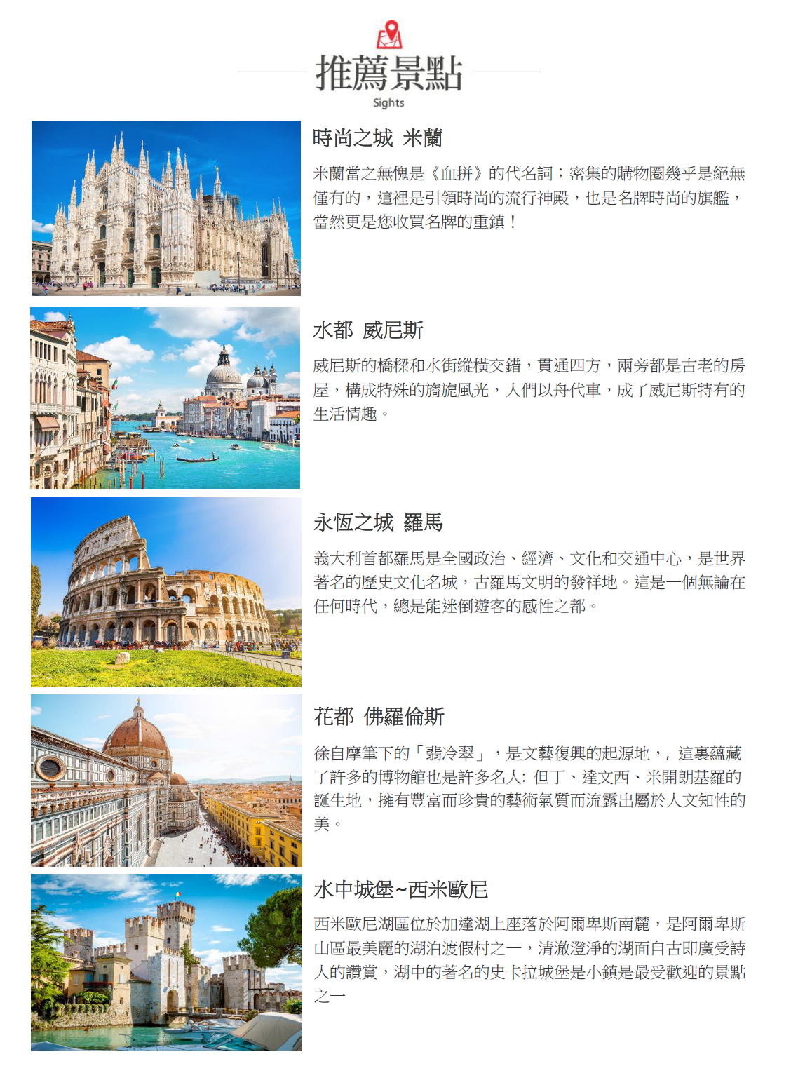 義大利米蘭,素有時尚之都美譽,交錯著藝術與時尚。以白色大理石砌成的米蘭大教堂,是經典地標,為世界第三大教堂,擁有135座尖塔、2245尊雕像,是典型的哥德式建築,也是世界第二大的哥德式教堂,聞人徐志摩曾以《大理石的詩篇》來形容教堂之美。艾曼紐迴廊建築呈十字形,這座華麗商場有-米蘭的大客廳之稱,匯集各式高貴的商家,是米蘭最繁華的地區。米蘭當之無愧是《血拼》的代名詞;密集的購物圈幾乎是絕無僅有的,這裡是引領時尚的流行神殿,也是名牌時尚的旗艦,當然更是您收買名牌的重鎮!在此輕鬆漫步,便能領略米蘭融合古今的獨特魅力。