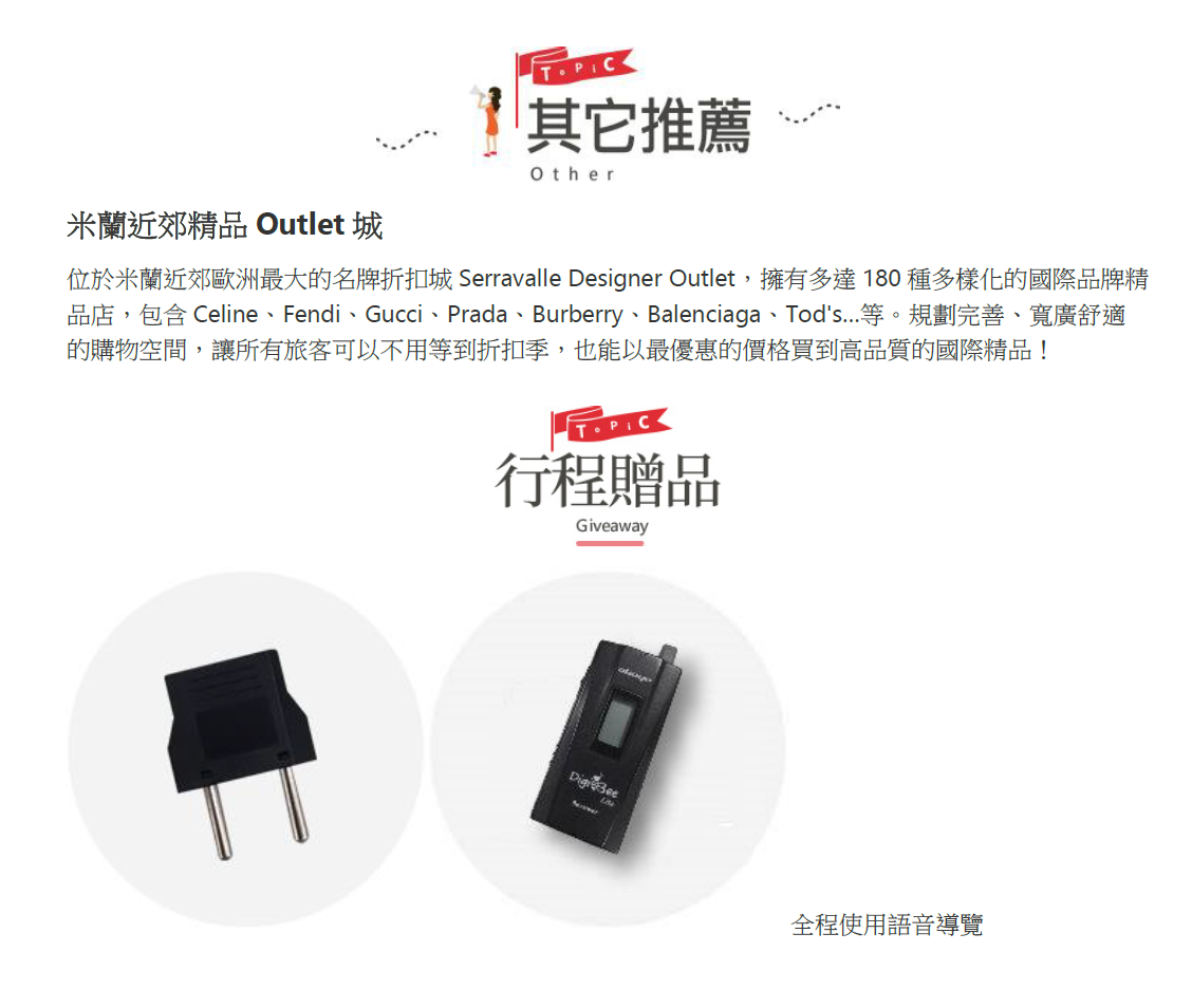 位於米蘭近郊歐洲最大的名牌折扣城Serravalle Designer Outlet,擁有多達180種多樣化的國際品牌精品店,包含Celine、Fendi、Gucci、Prada、Burberry、Balenciaga、Tod's…等。規劃完善、寬廣舒適的購物空間,讓所有旅客可以不用等到折扣季,也能用最優惠的價格買到高品質的國際精品,盡情享受購物之樂。