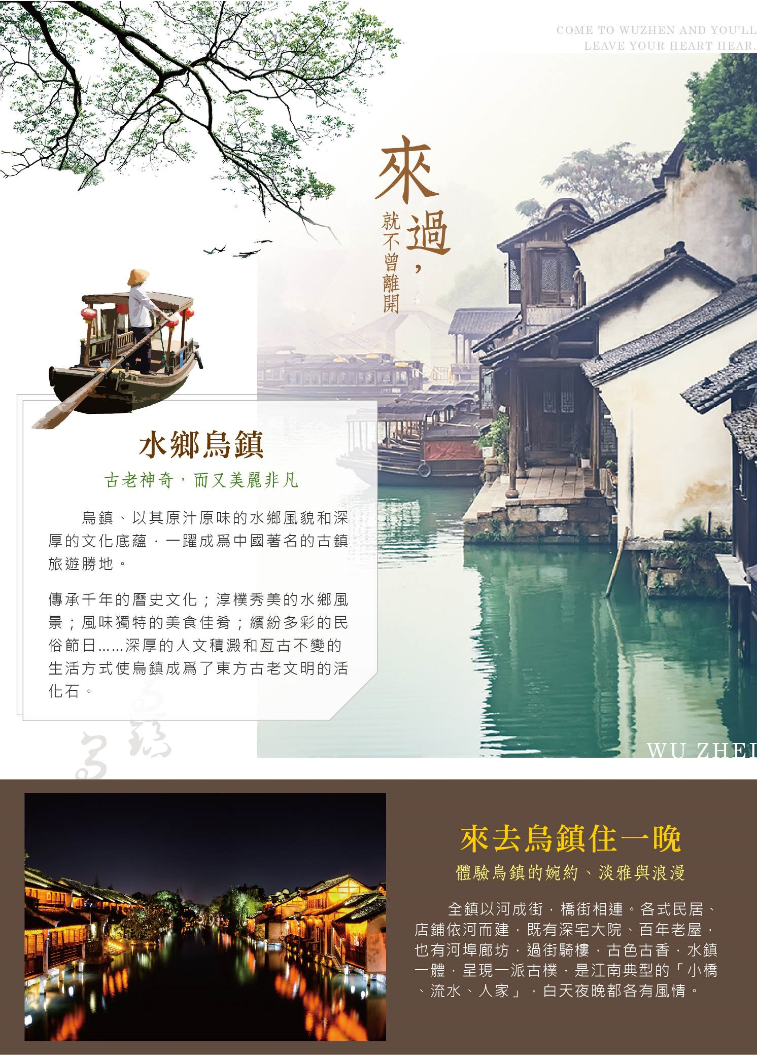 是江南水鄉六大古鎮的中心位置,千百年來烏鎮建築臨河而建、傍橋而市,雖歷經時代的滄桑,但烏鎮的街道上仍完整保存水鄉古鎮的風貌及建築風格,獨特的臨水建築「水閣」,透露出樸實古香的韻味,因此烏鎮被稱為「中國最後的枕水人家」,東、西、南、北四條街呈現「十」字交叉形成棋盤式河街平行與水陸相鄰的格局,街道兩旁大量的明清建築,從樑、柱、門到窗上的木雕和石雕工藝都十分精湛,與河上的石橋表現出小橋、流水的江南古鎮風情。