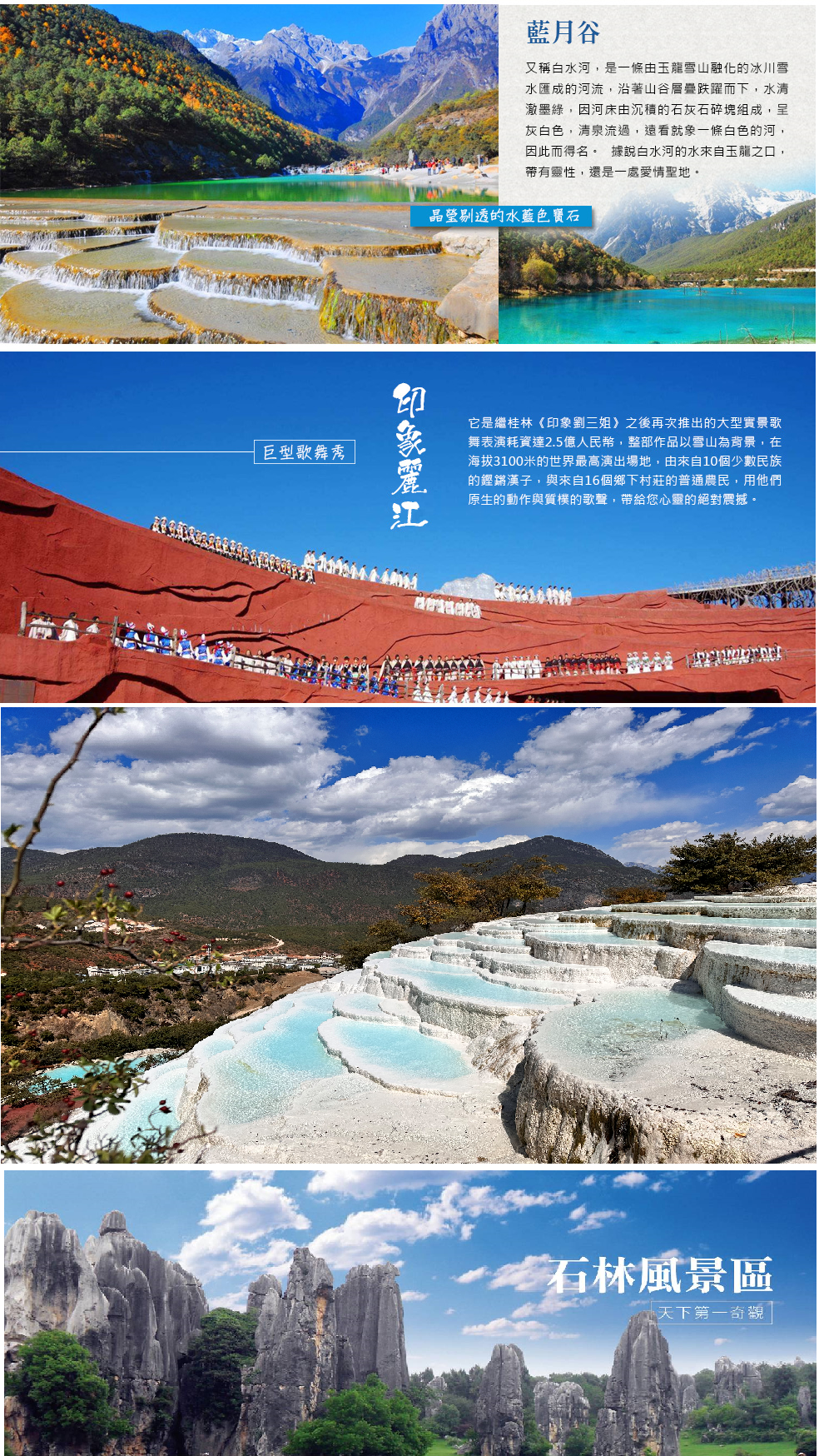 被譽為天下第一奇觀。石林為石灰岩地溶岩地貌(也稱喀斯特地貌)比較集中的地區,由巨厚的岩層構成,其岩峰猶如密佈的林木,數不清的崎嶇石峰和高聳峭壁,蔚成一片石林峰海,氣勢磅礡!景區由大、小石林、乃古石林、大疊水、長湖、月湖、芝雲洞、奇風洞等7個風景區組成,其中以石林的像生石,數量多、景觀價值高,舉世罕見。較為出名的有大石林、小石林、石林湖、獅子亭、劍峰池、蓮花峰、愛情海、幸福湖等,登上「望峰亭」可見石林景色迷離縹緲,令人如入童話世界,也是遊客留連之處。
