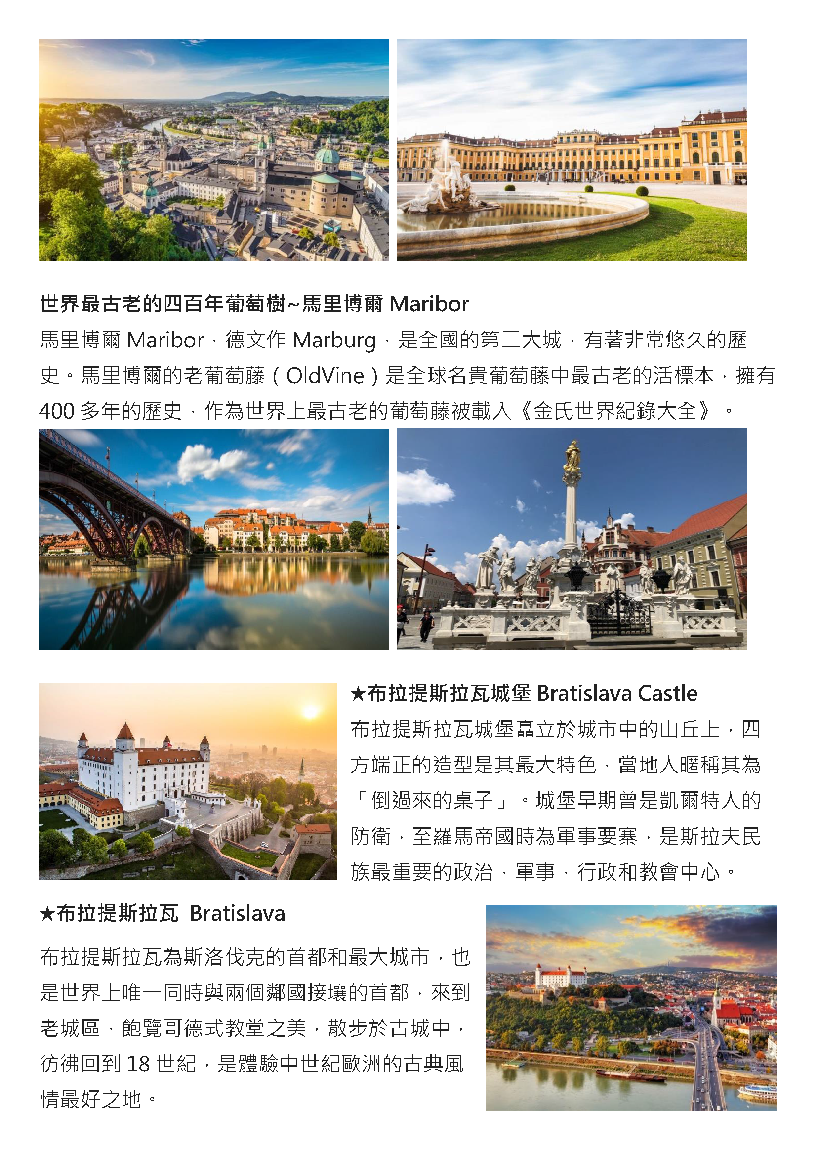 斯洛伐克是1993年才從捷克分離獨立的新興國家,相較於東歐其他工業繁榮的捷克、匈牙利等國,位居其中的斯洛伐克,純樸的農業社會生活步調,呈現出獨特的風貌,今天展開首都布拉提斯拉瓦之旅,前往富麗堂皇的●國家劇院、美麗的●聖馬丁教堂,接著穿越古色古香的●米榭爾門,前往舊城區中心的總統府廣場,一旁融合哥德與巴洛克風格的●舊市政廳吸引眾人的目光。在舊城區的街道上,有許多深受觀光客喜愛的雕塑作品,包括法國士兵、下水道工人、拿帽子的老紳士…等,每一個雕塑的背後都流傳著有趣的故事,為古城之旅增添許多樂趣。