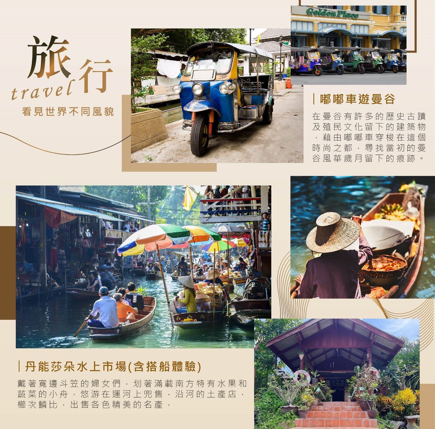 在曼谷有許多的歷史古蹟及殖民文化留下的建築物,現今部分已轉為其他性質,藉由嘟嘟車穿梭在這個時尚之都,尋找當初的曼谷風華歲月留下的痕跡,帶您深刻去感受這個城市,過去與未來的衝突美感。