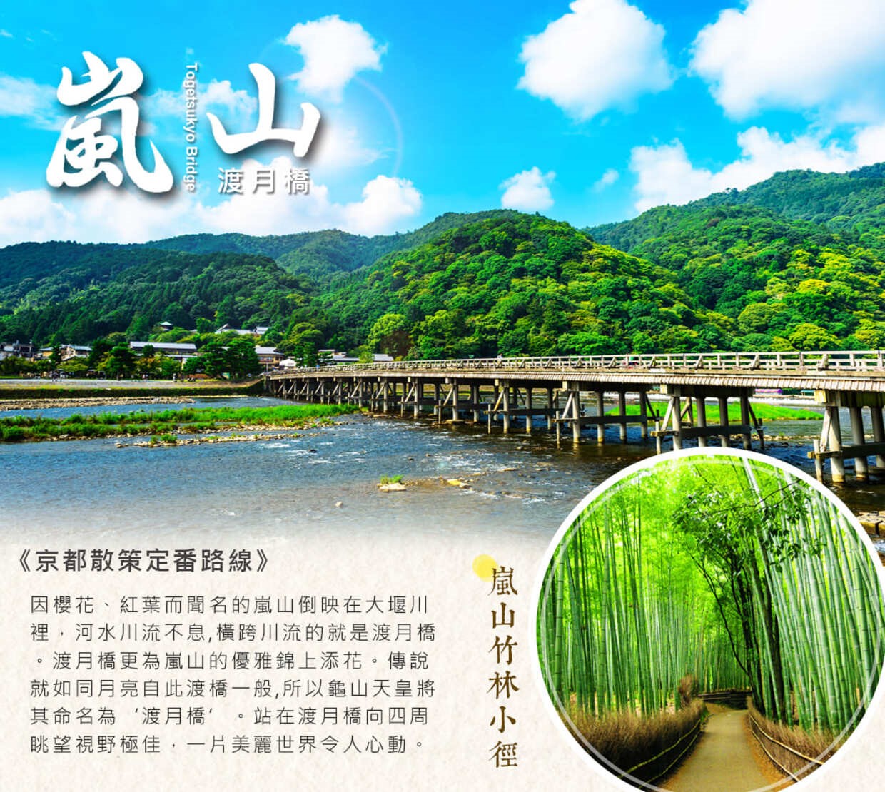 渡月橋為嵐山的優雅錦上添花。傳說就如同月亮自此渡橋一般,所以龜山天皇將其命名為‘渡月橋’。現在的渡月橋是昭和9年完成的,當初設計將其融入嵐山的景物名勝。站在渡月橋向四周眺望視野極佳,可以看見嵐峽及嵐山公園的迷人景緻、小橋、流水,一片美麗的世界令人心動,並可以沿著堤岸漫步。