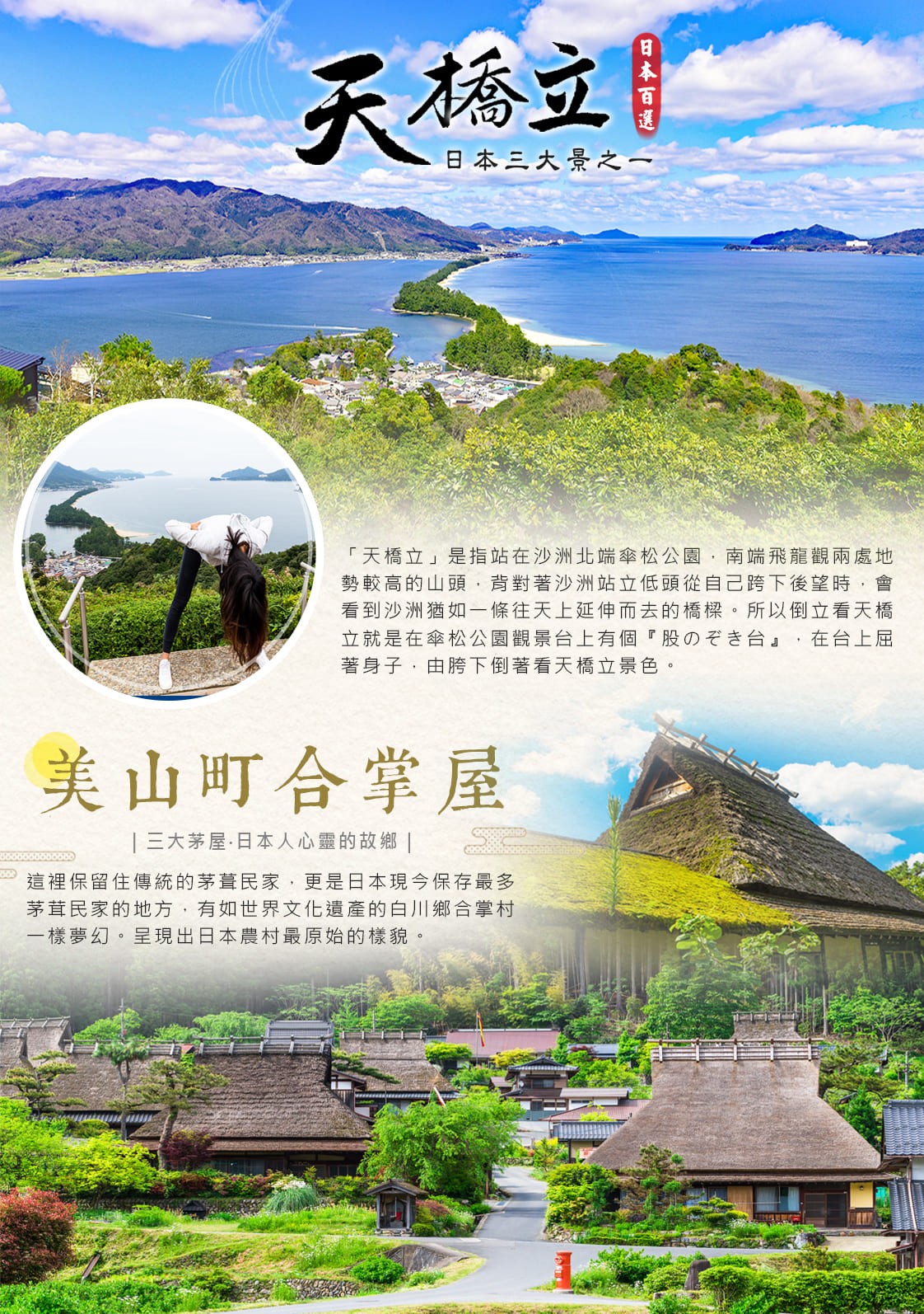 被日本媒體譽為「日本人心靈的故鄉」,這裡保留住傳統的茅葺民家,更是日本現今保存最多茅茸民家的地方,有如世界文化遺產的白川鄉合掌村一樣夢幻。沿河岸建築的茅葺民家正是美山町最大的特色,與自然風景融為一體的風景,呈現出日本農村最原始的樣貌。國家指定傳統的建造物群保存地區。來到這裡,一定可以了解到什麼是與自然的共生共存,在這個美麗且貼近自然的小村落沒有鐵路經過、也沒有直達的巴士,由於交通不便,令美山町的茅屋群像個美麗的秘境。