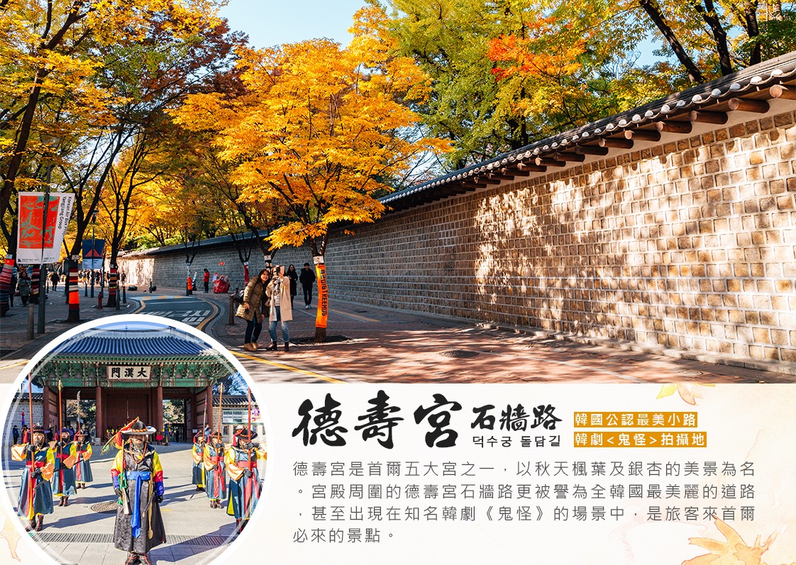 德壽宮為朝鮮王朝第九代國王成宗興建的王家私邸,後改用作正宮,是朝鮮王朝末日本帝國侵略的歷史舞臺。保存有韓國最早的西洋建築石造殿以及水鐘自擊漏而聞名。藝術石牆路,被譽為首爾最美的石牆路,是韓劇及廣告中常出現的取景地。