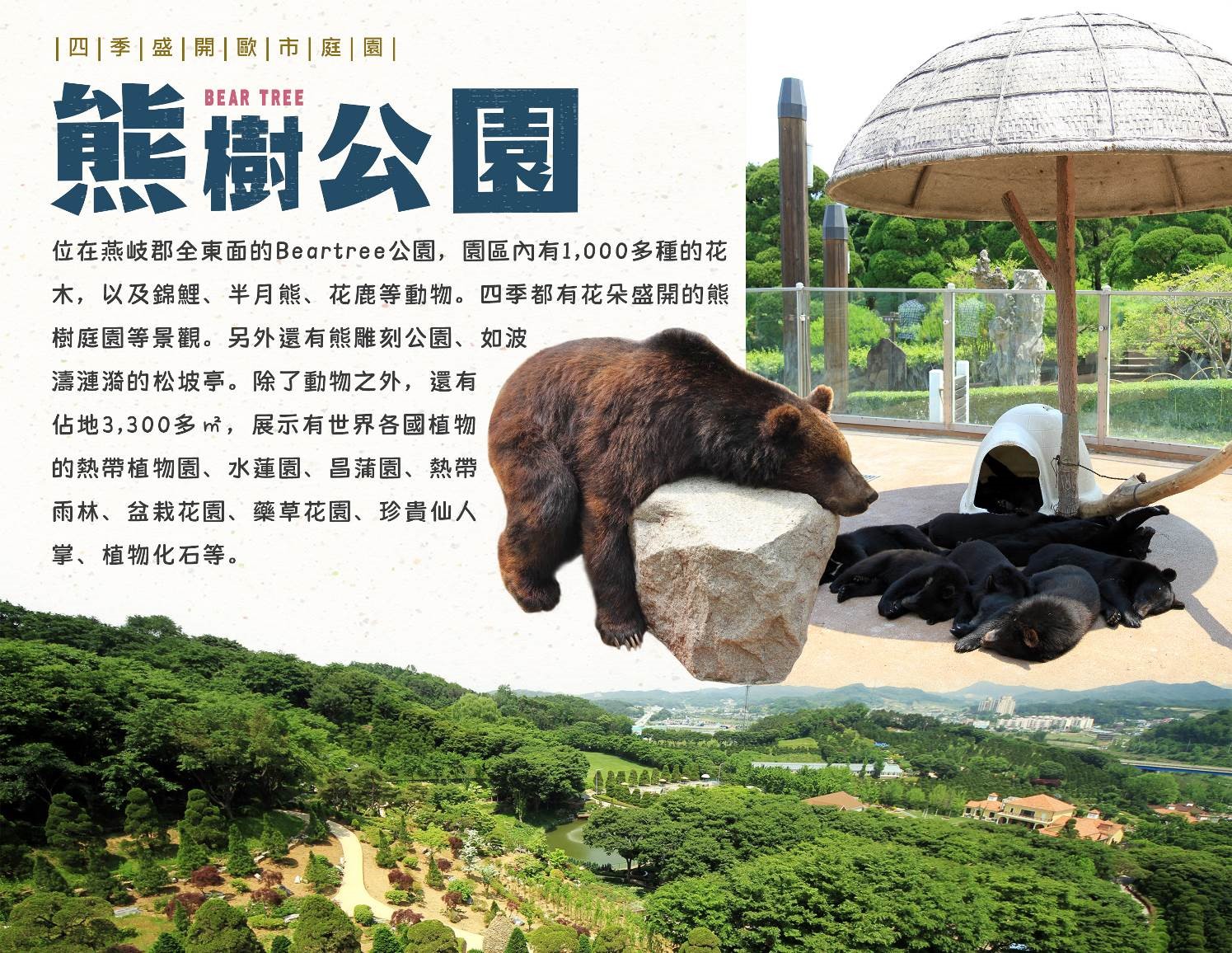 位在燕岐郡全東面的Beartree公園面積約33萬多㎡(10萬坪),園區內有1,000多種的40多萬株花木,以及錦鯉、半月熊、花鹿等動物。除了有500多條錦鯉悠游的五色蓮池、觀景臺、松樹瀑布、四季都有花朵盛開的熊樹庭園等景觀,還可以看到小半月熊與孔雀、花雉雞、鴛鴦等小動物,及數十隻熊表演的雜技秀、花鹿與四不像、美洲赤鹿。另外還有熊雕刻公園、如波濤漣漪的松坡亭。 除了動物之外,還有佔地3,300多㎡,展示有世界各國植物的熱帶植物園、水蓮園、昌蒲園、熱帶雨林、盆栽花園、藥草花園、珍貴仙人掌、植物化石等。可以在樹齡超過100年以上的香樹林裡散步,還可以看到以韓國板圖為造型,利用800年的槻木所構成的美麗歐式庭園。