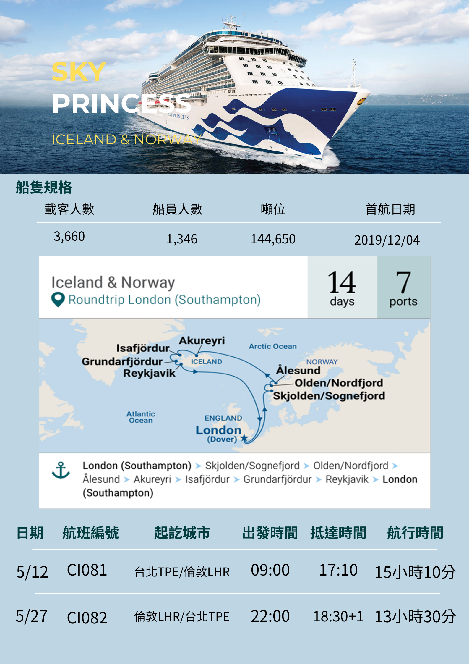 參觀之後前往南漢普敦港口辦理登船手續 ! 登上公主遊輪的星空公主號Sky Princess,當您進入的華麗大廳時,專業的服務人員正喜悅地歡迎每位貴賓登船。當全船所有人都參加救生演習後,豪華遊輪於鳴笛中緩緩離開碼頭。今天前往碼頭辦理登船手續,碼頭人數眾多,請您耐心等候。請將行李繫上船艙行李條,遊輪上的工作人員會將您的行李送至您的房間。