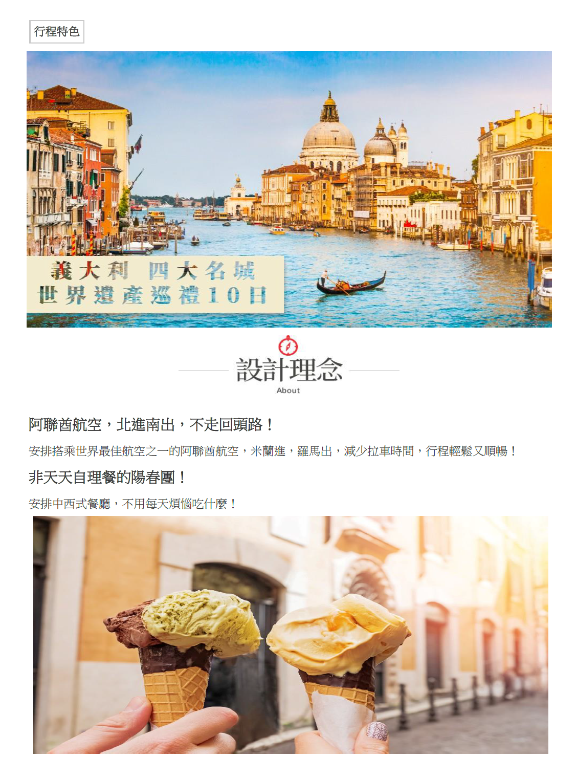 海中之城威尼斯~這個由商人建造的水都,位於義大利北部臨威尼斯灣,其被略呈青綠的水所環繞的市街,實際分佈在118座小島上靠160條四通八達的運河與四百座橋連結,遊憩的風情激動著各國遊客的旅情。威尼斯不僅僅充滿浪漫的情調,更含蘊著獨特的文化涵養,讓威尼斯人從千餘年前驕傲至今。威尼斯的美~是水也是陸,是流動又靜止,蜿蜒的運河連繫著小橋,先後參觀聖馬可大教堂、鐘樓、大廣場、道奇宮、嘆息橋等。在浪漫之中,古老歷史的痕跡也鮮明存在。運河、鳳尾船、古橋、夕陽,交織成水都獨一無二的浪漫景緻。空閒之餘您可自由漫步於購物精品街上,或是餟飲一杯濃濃的義式濃縮咖啡。