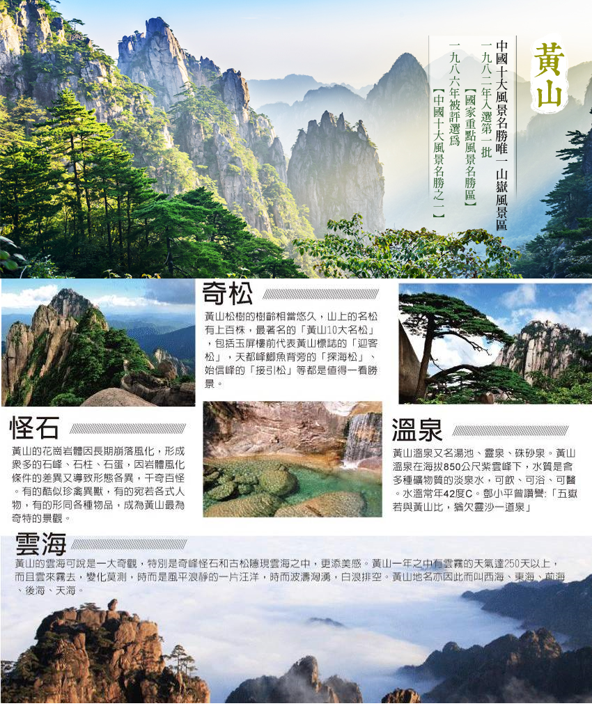 距於風景秀麗的皖南山區, 它以「三奇四絕」的奇異風采名冠於世。1982年黃山被國務院列為首批國家級 重點風景名勝區,1986年經評選列入中國十大風景名勝區,1990年被聯合國教科文組織列入「世界遺產」名錄。黃山是以自然景觀為特色的山嶽旅遊風景區,奇松、怪石、雲海、溫泉素稱黃山「四絕」,令海內外遊人歎為觀止。
