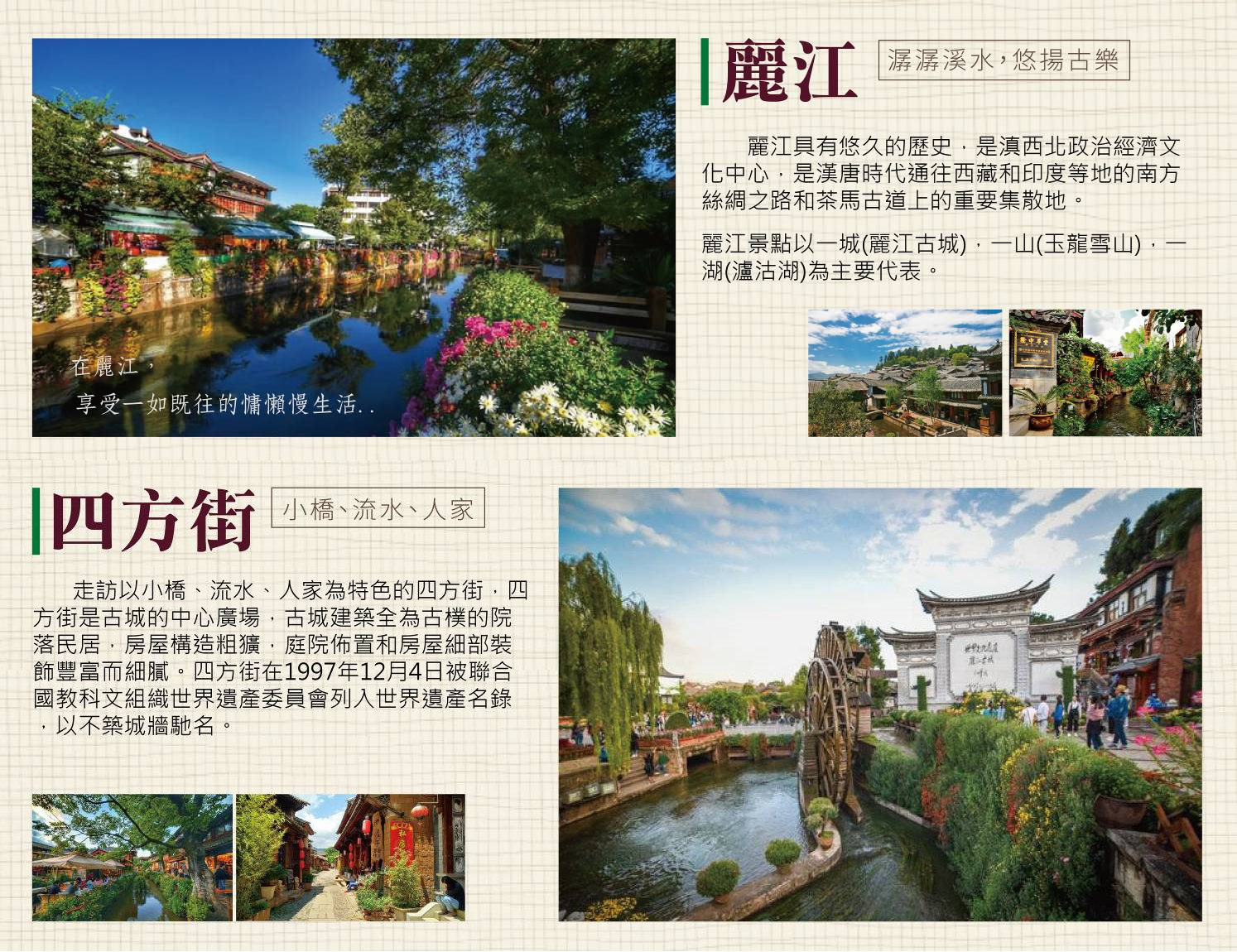 儘管街道兩旁都是舖面,可樓上的各式花窗一串串火紅的辣椒,都透出濃濃的生活氣息,古城裡的三眼井來自地底源源不絕的泉水,依地勢將它由高而低分隔成三個水池,第一池為泉水源頭是做飲水用,泉水流到了第二池就做清洗果菜之用、再流下來是第三池婦女洗衣、洗器具全在這是最有特色的用水方式。這裡有鋪著五彩石幽長的小巷、古老的小橋、楊柳、清風、流水、人家的美景;一個讓您還會想再來的地方。 【麗江古城悠閒自由時光,特別安排下午茶】