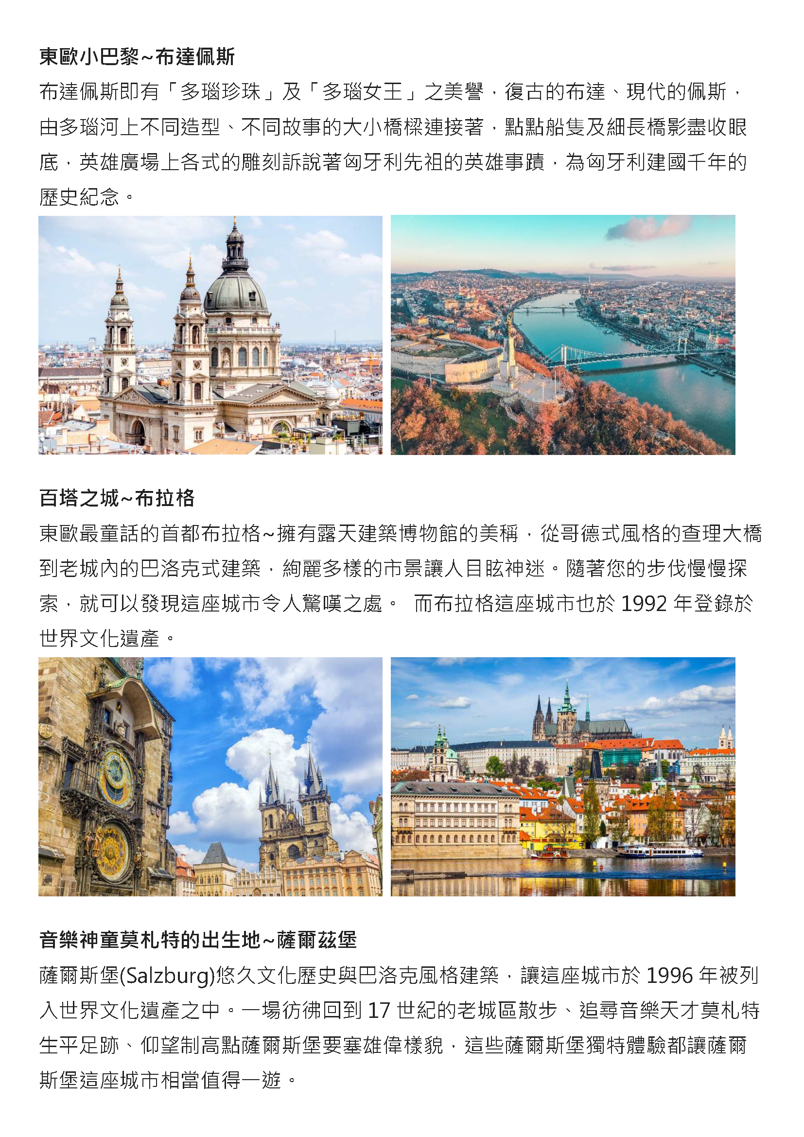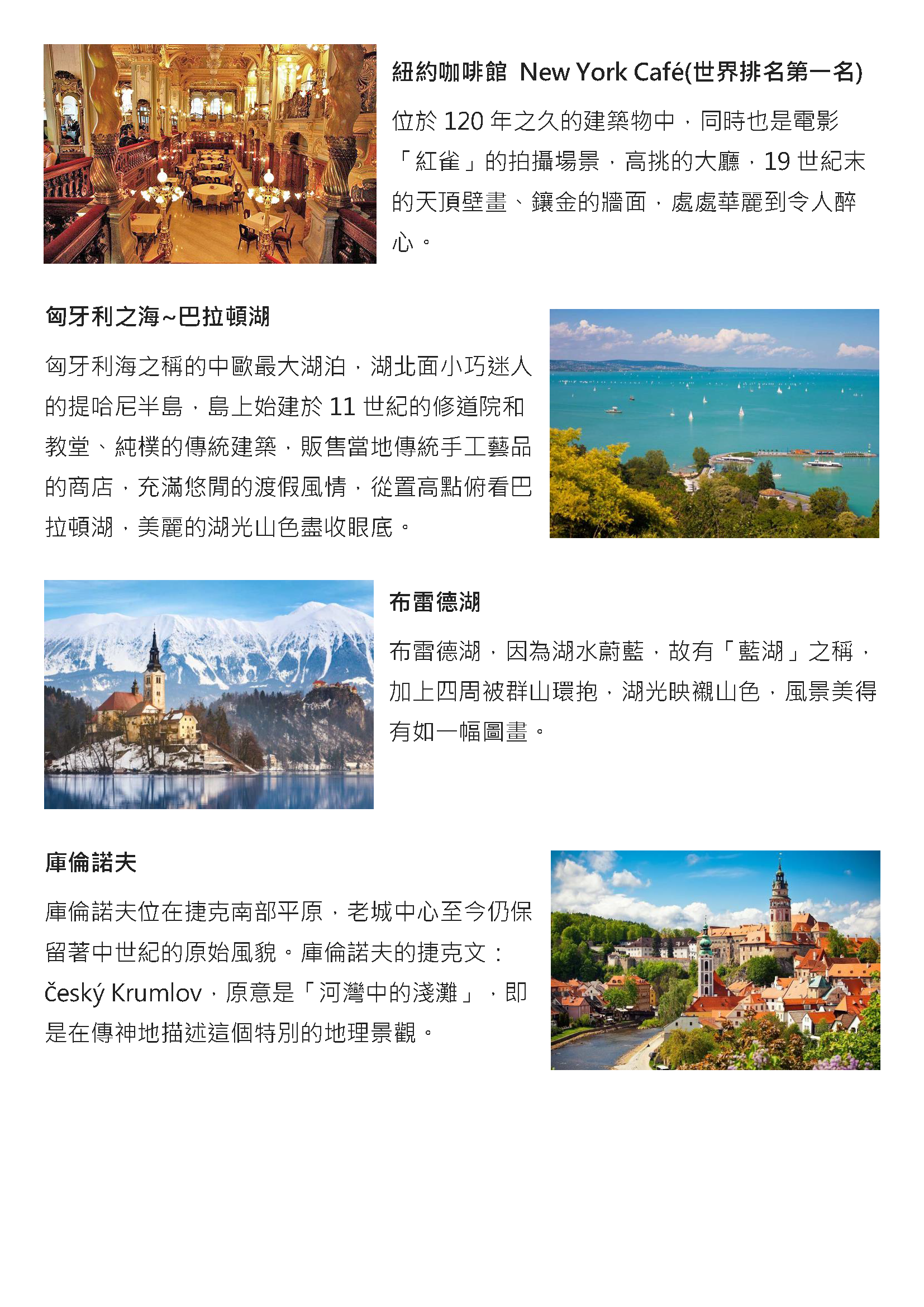 遊覽矗立著匈牙利建國千年紀念碑的●英雄廣場、布達佩斯市民休憩的場所。之後參觀有布達佩斯瞭望臺之稱的◎漁夫堡,由迴廊上可眺望對岸新哥德式的國會大廈及多瑙河上來往的船舶;並至歷任國王加冕的◎馬提亞斯教堂,精雕細琢裝飾的石造尖塔與色彩繽紛的馬賽克鑲嵌屋頂是此教堂的特色。●鎖鏈橋,橋的兩側個有二頭獅子鎮守。夜晚在燈光的照射下無比美麗。●瓦采街兩旁不但禮品店、百貨公司林立,還有一家家露天攤販以及街頭藝人在表演,你可在此漫步欣賞街景以及輕鬆購物。一路延伸至●中央市場,還聚集了各種讓人愛不釋手的民俗藝品,像是傳統服飾盛裝的匈牙利娃娃、手工刺繡品、附有可愛木匙的匈牙利香料、製作精細的陶瓷玻璃製品、粗獷風味的披風背心等等,每家商店都各有特色。想要各式的紀念品都可以在此尋獲。下午特別安排可媲美宮殿,號稱世界最美麗的咖啡館★紐約咖啡館(含一杯咖啡或茶或熱可可&蛋糕)。享用悠閒下午茶,體驗布達佩斯富麗堂皇而迷人的咖啡館氛圍。
