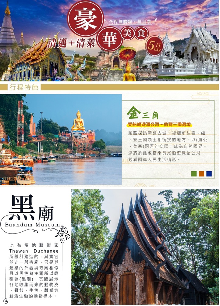 順路探訪清盛古城,後繼前往泰、緬、寮三國領土相銜接的地方,以(湄公、美塞)兩河的交匯,成為自然國界。您將於此處搭乘長尾船遊覽湄公河,含上寮國島,觀看兩岸人民生活情形。今日上岸寮國需視寮國海關是否同意上岸。