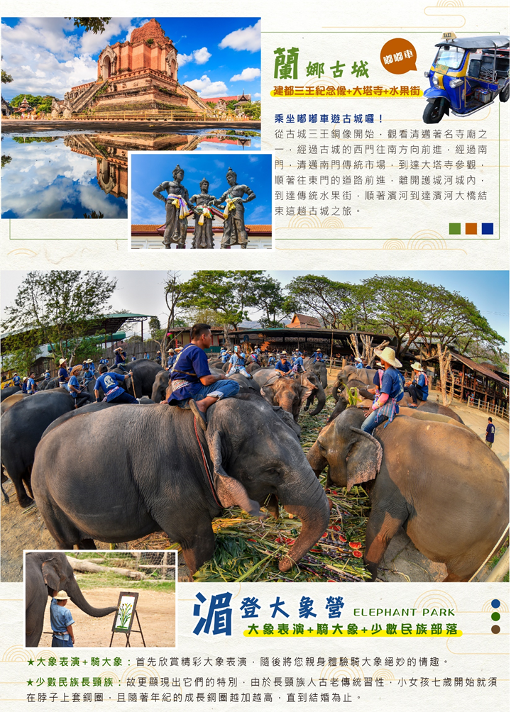 給各位貴賓來一趟叢林之旅四合一,首先來到【大象學校】於此參觀工作人員在訓練大小象的工作的情形並觀看他們所安排的精彩大象表演,大象現場作畫表演,欣賞可愛大象自由隨性揮瀷表演獨創的繪畫天份。隨後將您親身體驗騎大象絕妙的情趣,穿越叢林,體會古代皇帝用以代步座騎大象,品味越野情趣,此乃是人生一項難得又絕妙的回憶。接著安排各位乘坐竹筏 (每個竹筏可載 6-7個人) 來一趟難忘了竹筏遊,觀賞寧靜的山谷河川,及周圍叢林美景。接著坐牛車,牛車是昔日鄉下農家的交通工具,隨著時代的進步已早被淘汰和遺忘,但在這裡您可看到或親自享受時光倒流,體驗一下鄉間的 “牛車之旅”,您會感到格外的新奇有趣。
