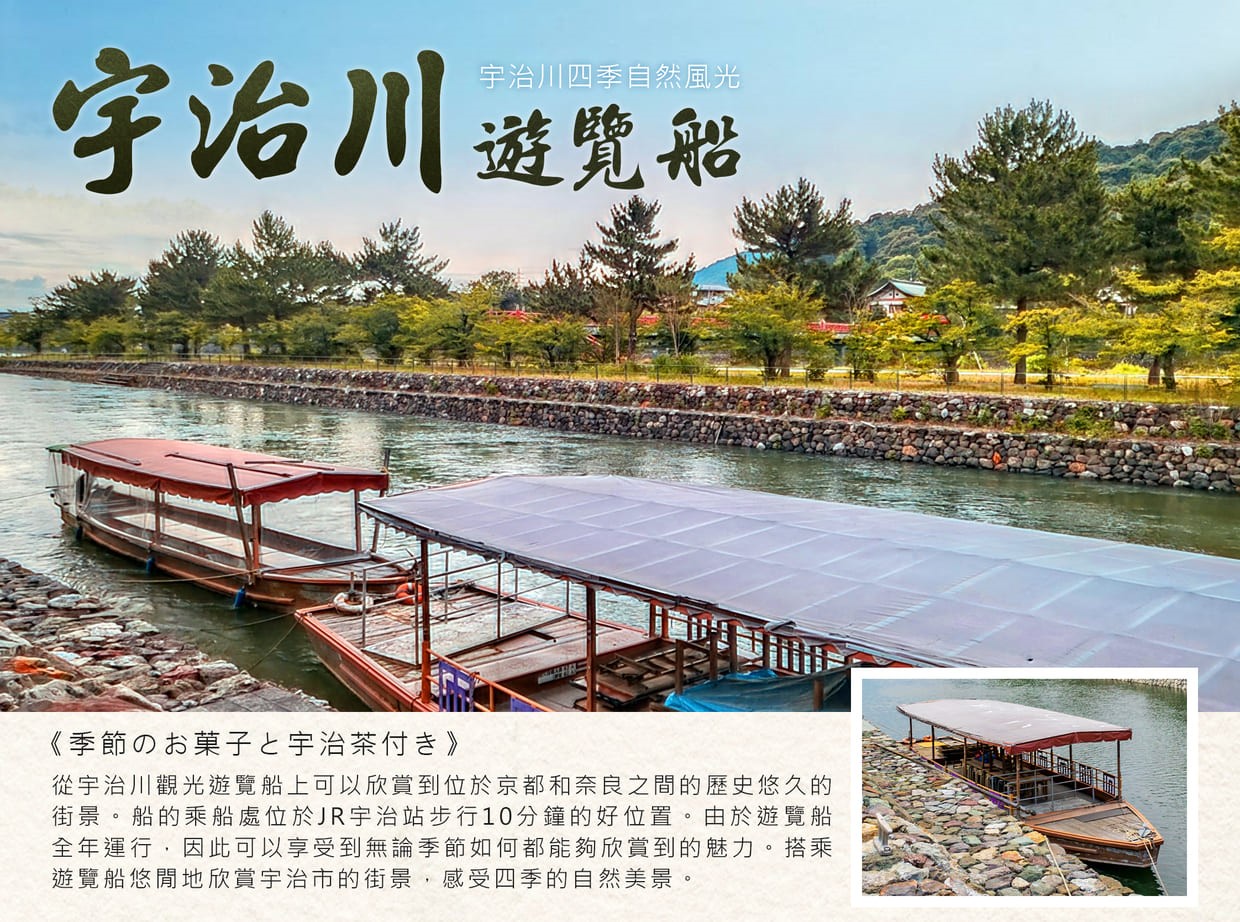 在充滿自然風情的宇治川,坐在船上一邊悠然自得地品嘗甜點,一邊觀賞川邊景緻,春天有淡香的櫻花、夏天有清澄的藍天、秋天有層林盡染的鮮豔紅葉,讓您充分感受宇治的歷史氣息與悠閒時光。