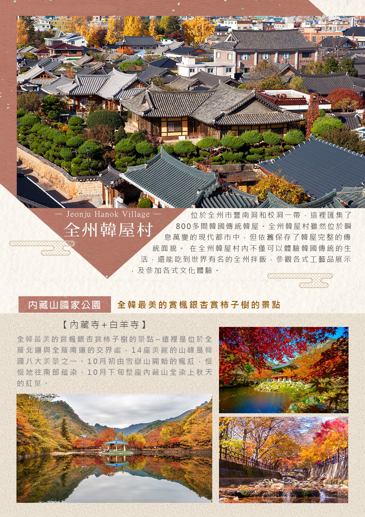 全韓最美的賞楓銀杏賞柿子樹的景點~這裡是位於全羅北道與全羅南道的交界處,14座美麗的山峰是韓國八大美景之一。10月初由雪嶽山開始的楓紅,慢慢地往南部蘊染,10月下旬整座內藏山全染上秋天的紅葉。10月底延續雪嶽山美麗楓紅的內藏山,吸引了許多前來賞楓的遊客。內藏山美麗的楓紅,讓人不禁要說,沒到過內藏山賞楓的人,根本不算真正賞過楓!內藏山上的超過6百年數齡的榧木與自然生成的交讓木群落等,形成了天然的絕景。尤其是秋天時從登山路口約500公尺的山路上,有一條被紅葉覆蓋的「丹楓走廊」,密集地坐落在山麓的兩旁,緋紅的楓葉遮蓋了藍天,有如紅瑪瑙綴於枝頭,讓人彷彿身在楓葉的天堂。實為不折不扣的紅葉名所,在秋天形成了一條燦爛的紅葉隧道。