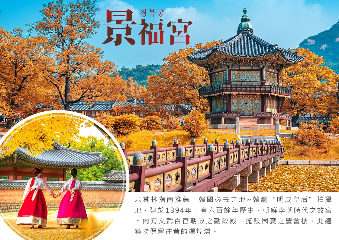 米其林指南推薦.韓國必去之地~韓劇“明成皇后”拍攝地,建於1394年,有六百餘年歷史,朝鮮李朝時代之故宮。內有文武百官朝政之勤政殿,擺設國宴之慶會樓。此建築物保留往昔的輝煌燦。景福宮正門—光化門前面的獬豸石雕與景福宮裡面的建築成一直線,讓整座古宮更顯威嚴 。最先看見的勤政墊,王室的象徵,也是以前國王舉行登基和各種儀式的主要場所。在勤政殿後方,則有國王處理政務、王室們的寢室以及舉辦宴會的各種建築。